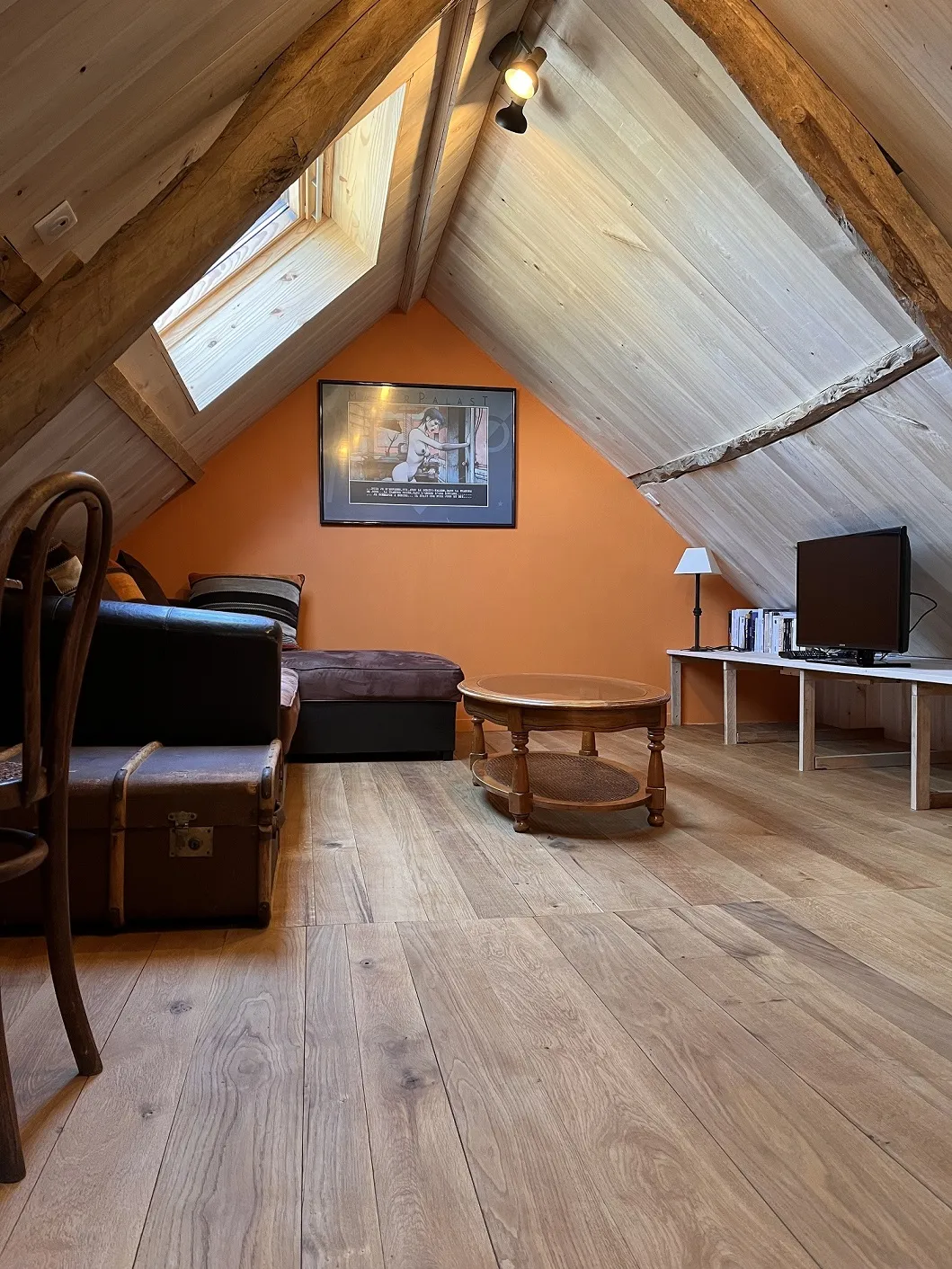 • Un salon avec télé, canapé, bureau, pupitre et jeux à disposition au 2éme niveau